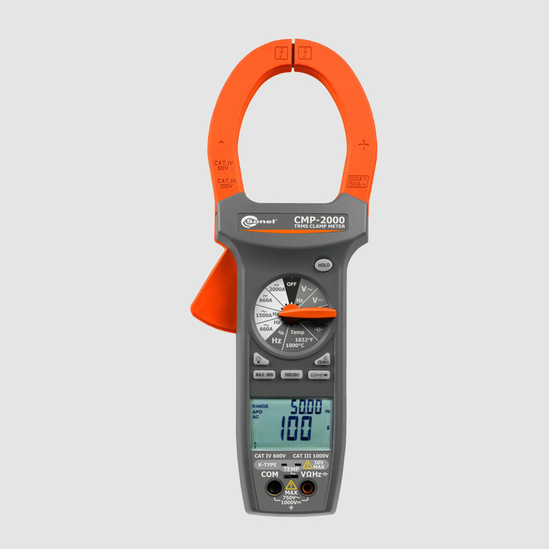 Das professionelle Zangenmultimeter Sonel CMP-2000 ist ein vielseitig einsetzbares Gerät, mit dem hohe Ströme von bis zu 2000 A unter Anwendung von Zangen an Leitungen von bis zu 57 mm Durchmesser und Bus-Leitungen von bis zu 70 x 18 mm gemessen werden können. Dank der speziellen INRUSH-Funktion kann der maximale Momentanwert des Stroms gemessen werden, der von dem Elektrogerät bei dessen Einschalten aufgenommen wird.